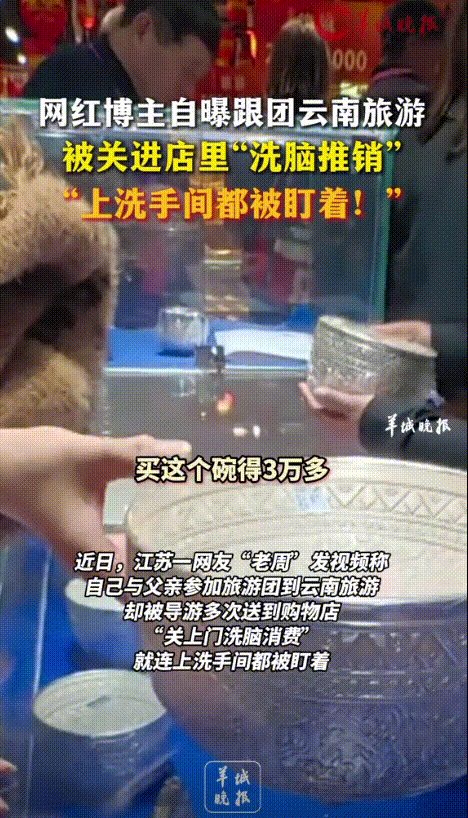 【网红跟老年团到云南旅游,碰到强制消费,千元起步?】压力给到云南文旅了!近日,江苏男人陪父亲去西双版纳旅游,着力却发现,旅游时代王人被导游困在购物店里听东谈主家授课和倾销,一个碗卖3万,一把梳子2千,一只手镯136万,以致连上个茅厕王人有使命主谈主员盯着,男人短暂暴怒,就地回怼曝光。