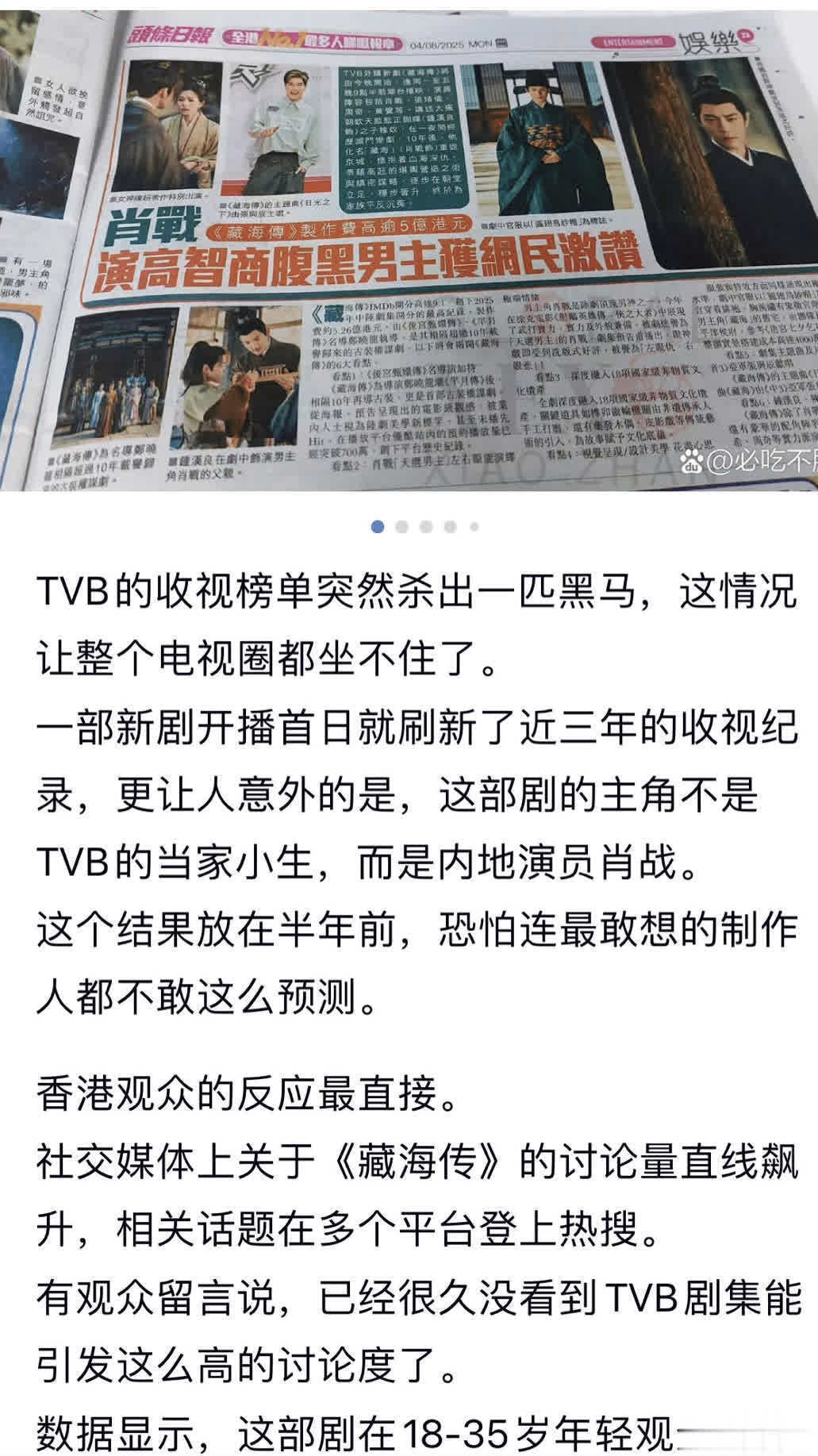 而这一秉性,注定《藏海传》不会局限于内地爆,而是会在各地爆了又爆。近日,《藏海传》在TVB开播,宛如横空出世的一匹黑马,以压倒性的上风雄居榜首。播出首日就刷新了近三年的收视记录。港媒《东方日报》称:肖战以一打十凭古装权略剧《藏海传》以断层式姿态登顶剧王宝座。可谓艳惊四座,让当地电视圈王人坐不住了,这也太猛烈了。
