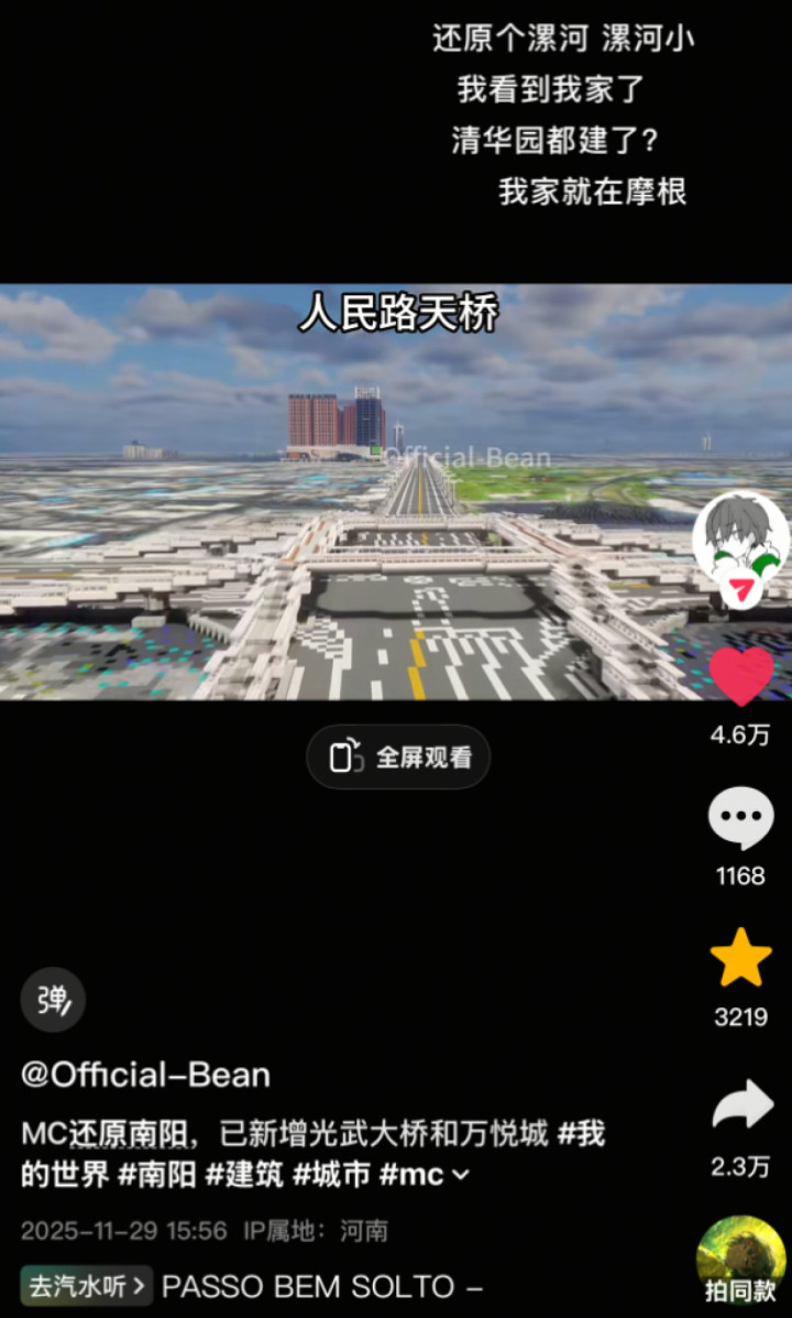 目前,@Offical-Bean在游戏中已收复了南阳市政府、光武大桥、摩根吾悦广场、东谈主民路天桥、府衙外街(未完工)、沉着广场、南阳火车站等十余个南阳象征性建筑。这些由一个个像素方块堆砌而成的捏造城市,竟呈现出不输本质的好意思感与暖和。