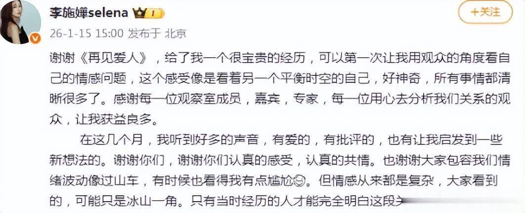 随后她在微博发布长文,莫得花哨的排版,莫得煽情的配图,字里行间却藏着说不尽的唏嘘,一句“当今不在一齐亦然咱们当下以为对的接纳”径直炸穿酬酢平台。