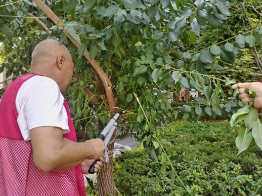 修剪前,网格员领先运筹帷幄了“口袋公园”隔壁停放汽车的车主将汽车移开,以防修剪掉落的树枝划伤车辆,随后,志愿者们顶着炎炎烈日,划分拿上了大剪刀、锯子、钩子、刀斧等器用,三两结对,协同进行。历程一下昼有序的修剪,大齐树枝被修剪下来了,“口袋公园”一霎亮堂了起来。志愿者们将修剪的树枝结合堆放,确保不影响住户的日常通行。