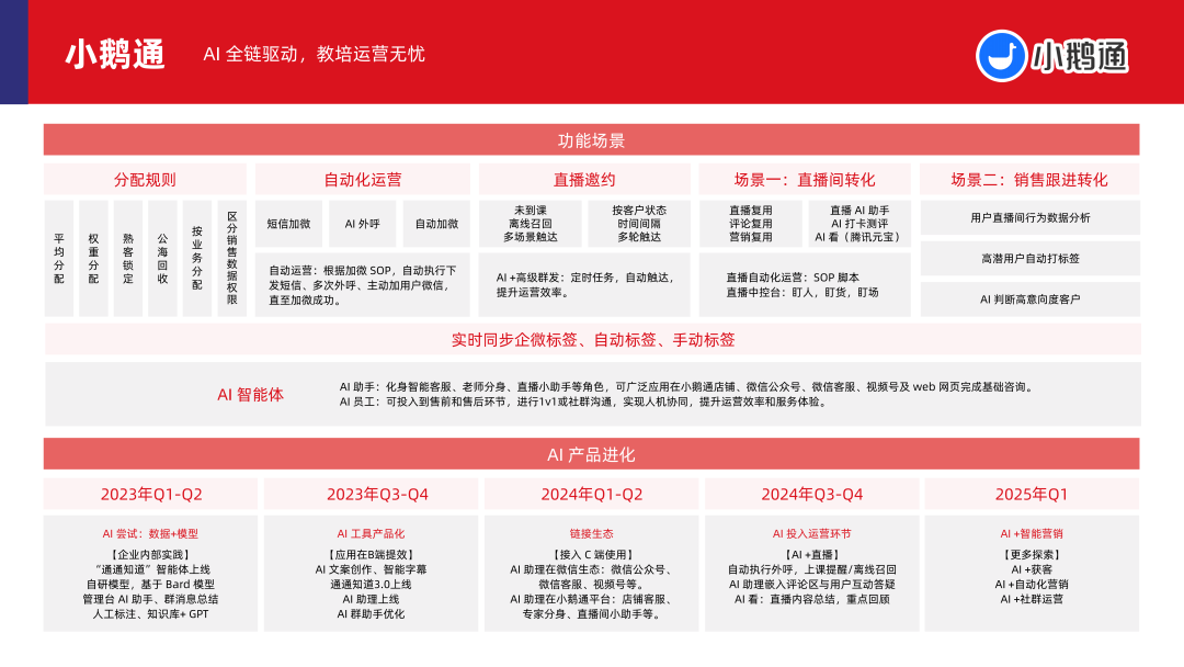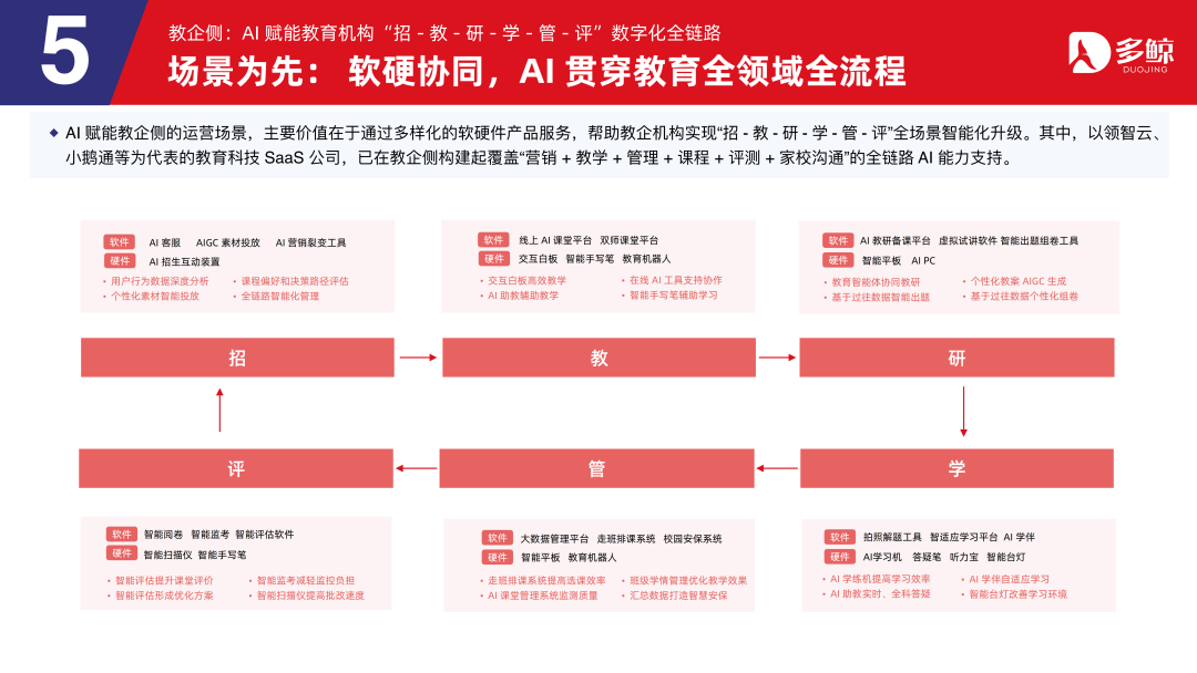 AI 赋能教企侧的运营场景,主要价值在于通过种种化的软硬件家具服务,匡助教企机构已毕「招-教-研-学-管-评」全场景智能化升级。其中,以领智云、小鹅通等为代表的缓助科技 SaaS 公司,已在教企侧构建起隐蔽「营销+教学+治理+课程+评测+家校相通」的全链路 AI 智商支执。
