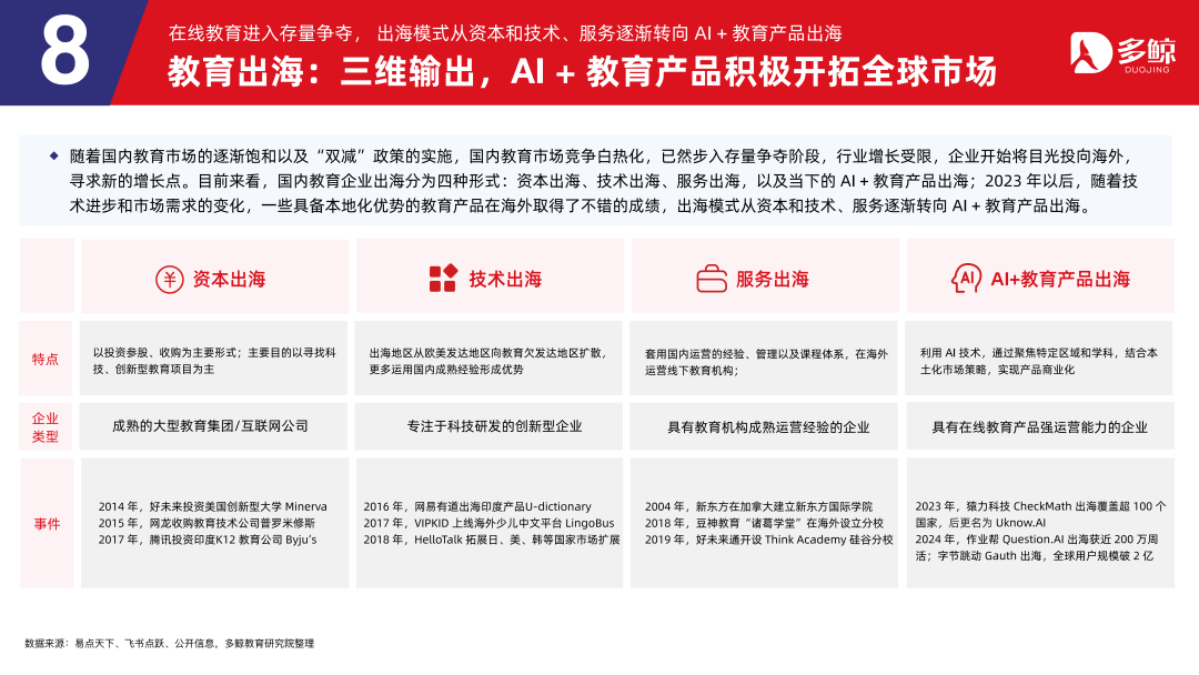 跟着国内缓助市集的缓缓实足以及「双减」政策的实施,国内缓助市集竞争尖锐化,顽强步入存量争夺阶段,行业增长受限,企业初始将眼神投向外洋,寻求新的增长点。目下来看,国内缓助企业出海分为四种体式:成本出海、时刻出海、服务出海,以及当下的 AI+缓助家具出海;2023 年以后,跟着时刻跳动和市集需求的变化,一些具备土产货化上风的缓助家具在外洋取得了可以的得益,出海模式从成本和时刻、服务缓缓转向 AI+缓助家具出海。