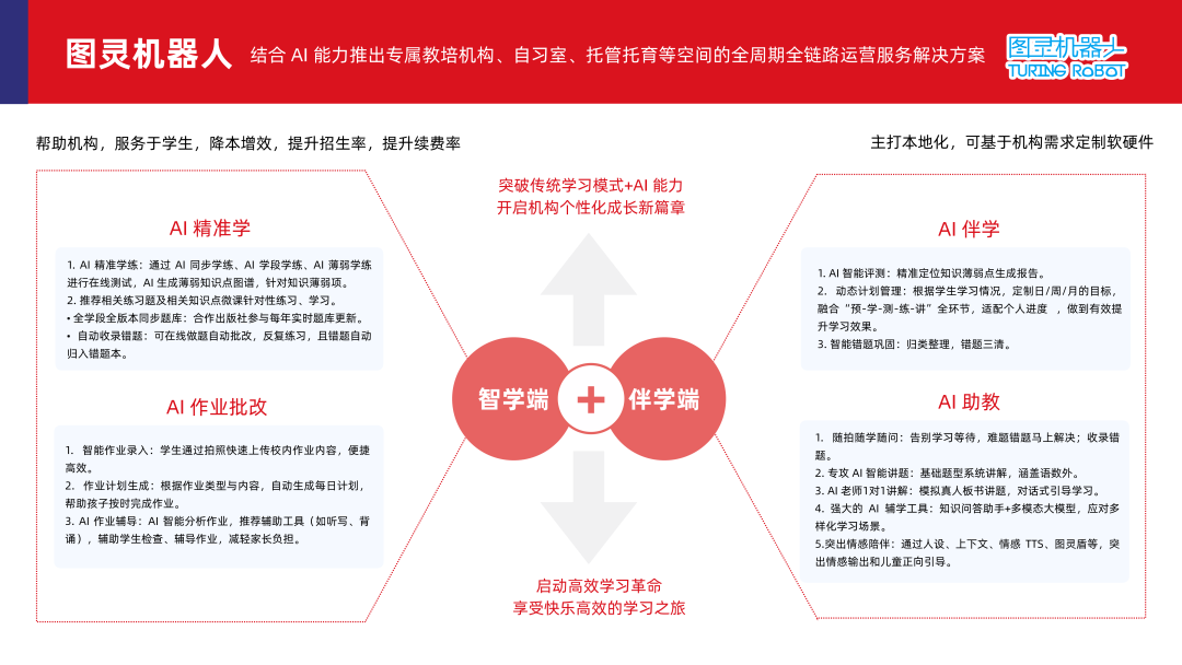 教企端,AI 时刻赋能「前端招生-中台教研及治理-后端教学服务」以及企业运营治理、赛事出口等全链路,旨在为企业降本增效。