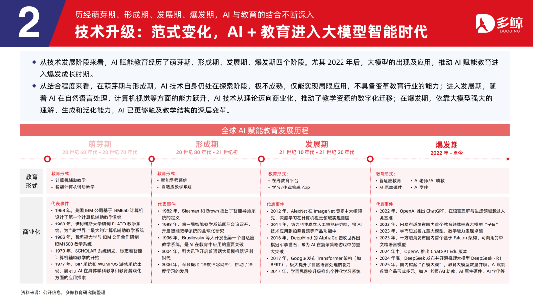 从联接程度来看,在萌芽期与酿成期,AI 时刻自身仍处在探索阶段,极不锻练,仅能已毕局限应用,不具备变革缓助行业的智商;进入发缓期,跟着 AI 在当然言语处理、诡计机视觉等方面的智商跃升,AI 时刻从表面迈向生意化,推动了教学资源的数字化移动;在爆发期,依靠大模子苍劲的理会、生成和泛化智商,AI 已更够波及教学结构的深层变革。