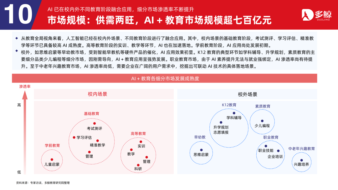 受政策影响,校内缓助信息化的 AI 浸透率日益攀升,不乏有企业中标金额过亿元的紧要技俩。校外市集,由于对个性化学习、教学服从晋升需求的日益增长,K12 缓助、教学缓助赛谈的 AI 合座浸透率较高。其次,早幼教畛域受到智能早教机、AI 玩物等硬件家具的催化,也茂密发展。在任业缓助和中老年兴致缓助畛域,由于行业参与者以少许头部机构为主,且短少代表性 AI 缓助智能硬件家具,市集规模尚有待晋升。