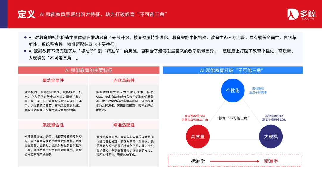 AI 赋能缓助不仅已毕了从「模范学」到「精确学」的跨越,更弥合了经济发展带来的教学质地差异,一定程度上冲突了缓助个性化、高质地、大规模的「不成能三角」。