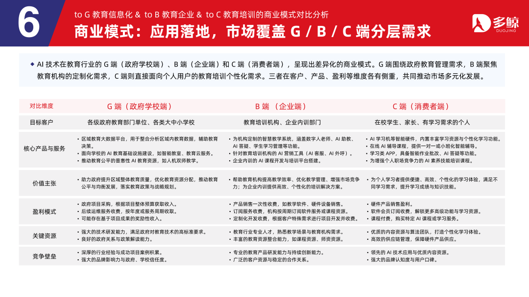 AI 时刻在缓助行业的 G 端(政府学校端)、B 端(企业端)和 C 端(亏空者端),呈现出差异化的生意模式。G 端围绕政府缓助治理需求,B 端聚焦缓助机构的定制化需求,C 端则径直面向个东谈主用户的缓助培训个性化需求。三者在客户、家具、盈利等维度各有侧重,共同推动市集多元化发展。