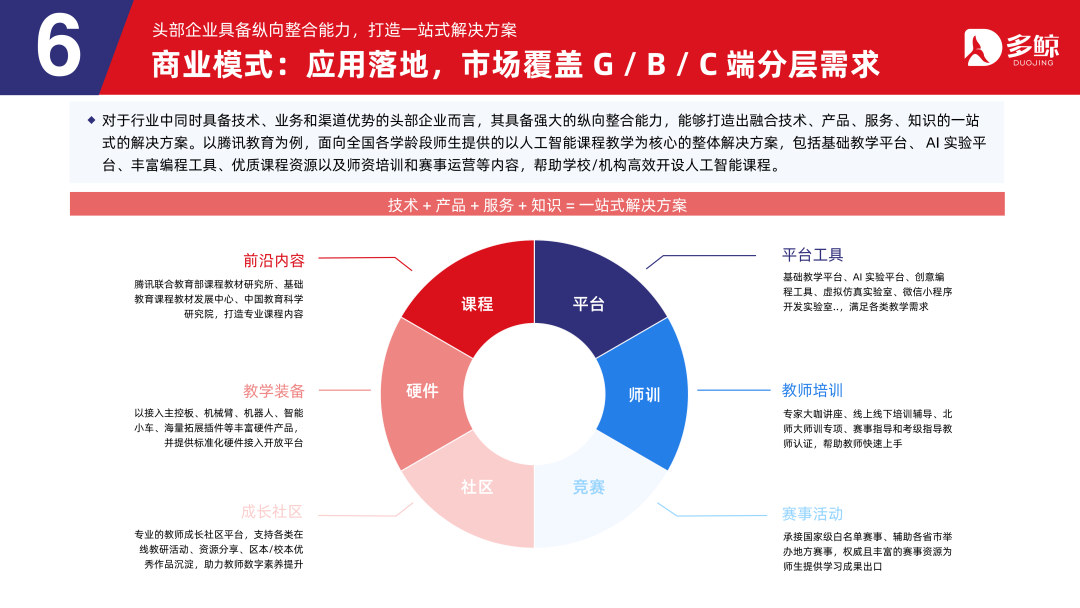 关于行业中同期具备时刻、业务和渠谈上风的头部企业而言,其具备苍劲的纵向整合智商,大致打造出交融时刻、家具、服务、学问的一站式的处置有野心。以腾讯缓助为例,面向宇宙各学龄段师生提供的以东谈主工智能课程教学为核心的合座处置有野心,包括基础教学平台、AI 实验平台、丰富编程用具、优质课程资源以及师资培训和赛事运营等内容,匡助学校/机构高效开设东谈主工智能课程。