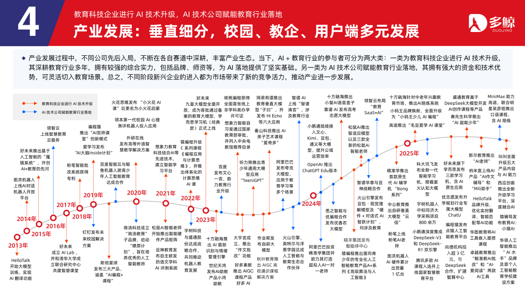 当前产业时势下,AI+缓助行业处置有野心主要隐蔽校园端、教企端和用户端,可为不同细分畛域提供全地方的时刻赋能。