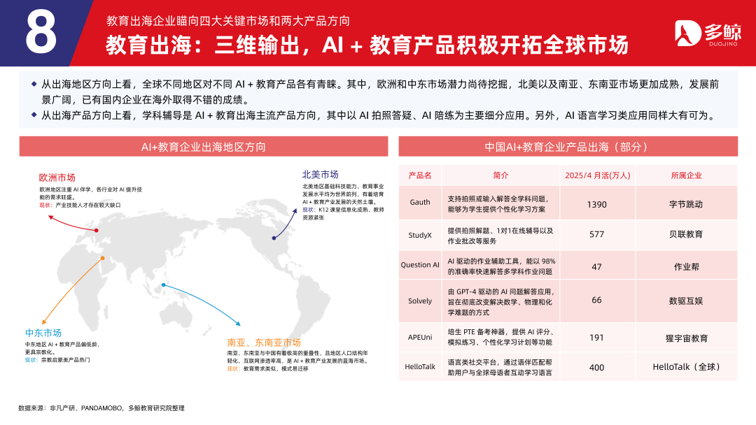 从出海家具方朝上看,学科指示是 AI+缓助出海主流家具标的,其中以 AI 拍照答疑、AI 陪练为主要细分应用。另外,AI 言语学习类应用同样锦绣前程。