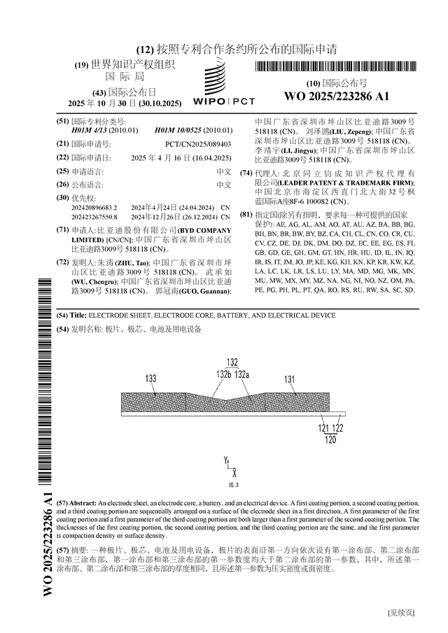 证券之星音信,字据企查查数据流露比亚迪(002594)公布了一项海外专利央求,专利名为“极片、极芯、电板及用电开辟”,专利央求号为PCT/CN2025/089403,海外公布日为2025年10月30日。