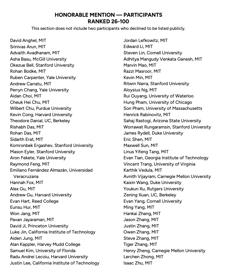 除了团队排名,普特南还有个东谈主排名。阐述公示效果炫夸,咱们看到排名Top5、乃至Top25学生,险些被华东谈主学生承包,其中还有不少咱们熟练的身影。