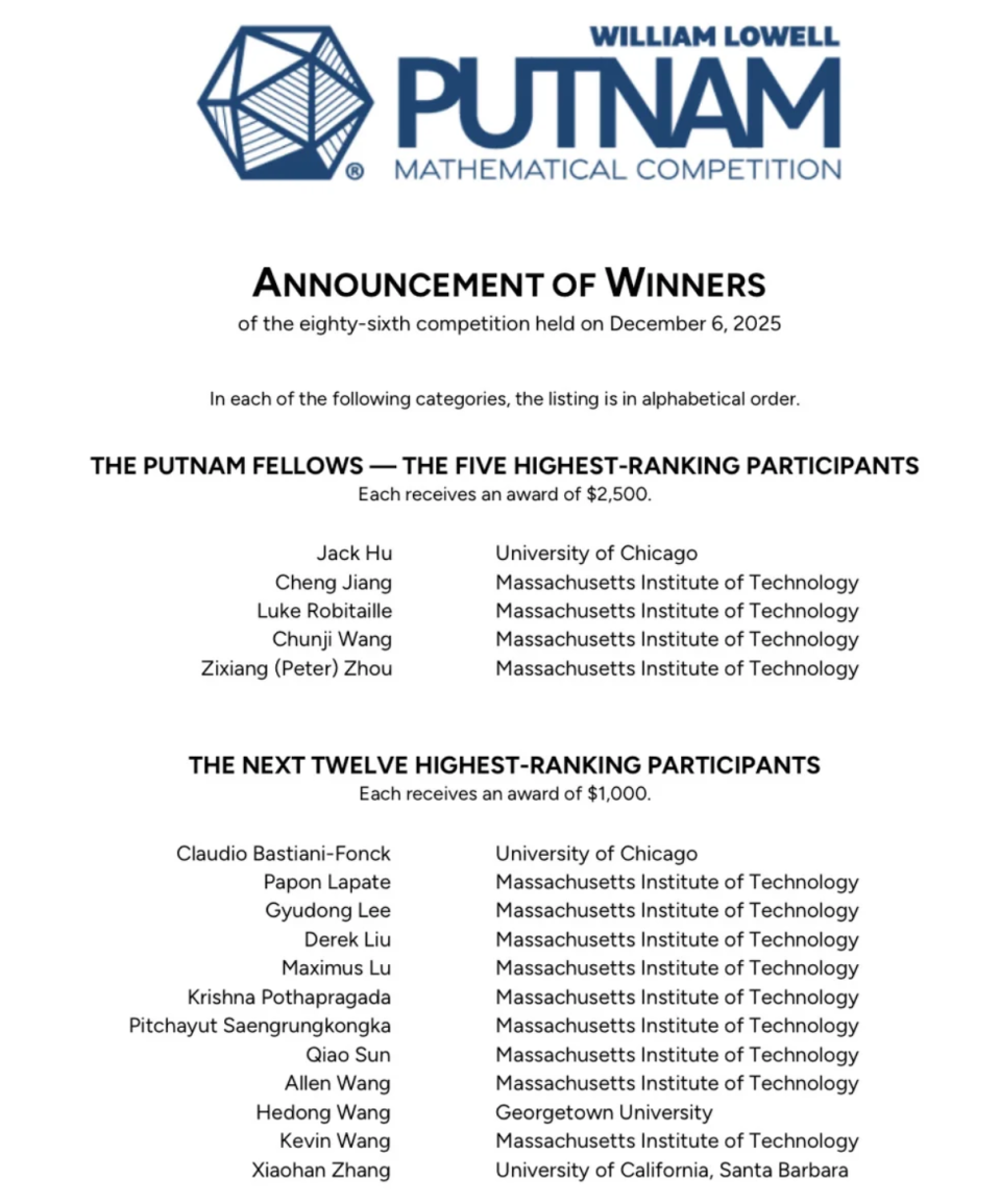 就在前天(26号), MAA(好意思国数学协会)晓示了第86届普特南数学竞赛效果。