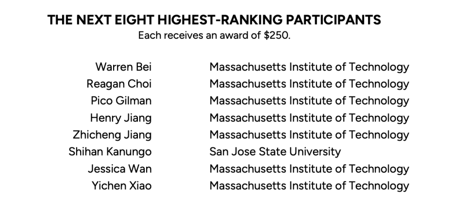 在TOP25的学生清单中,除了清一色的MIT学生外,咱们看到乔治城大学、加州大学圣塔芭芭拉分校、圣何塞州立大学(SJSU)的三位学生也榜上有名。这当中,有网友扒出,来自SJSU的Shihan Kanungo其实是一位高中生。据称,他能参加比赛是因为在SJSU上过课。据领英贵寓炫夸,Shihan一经被MIT考中。