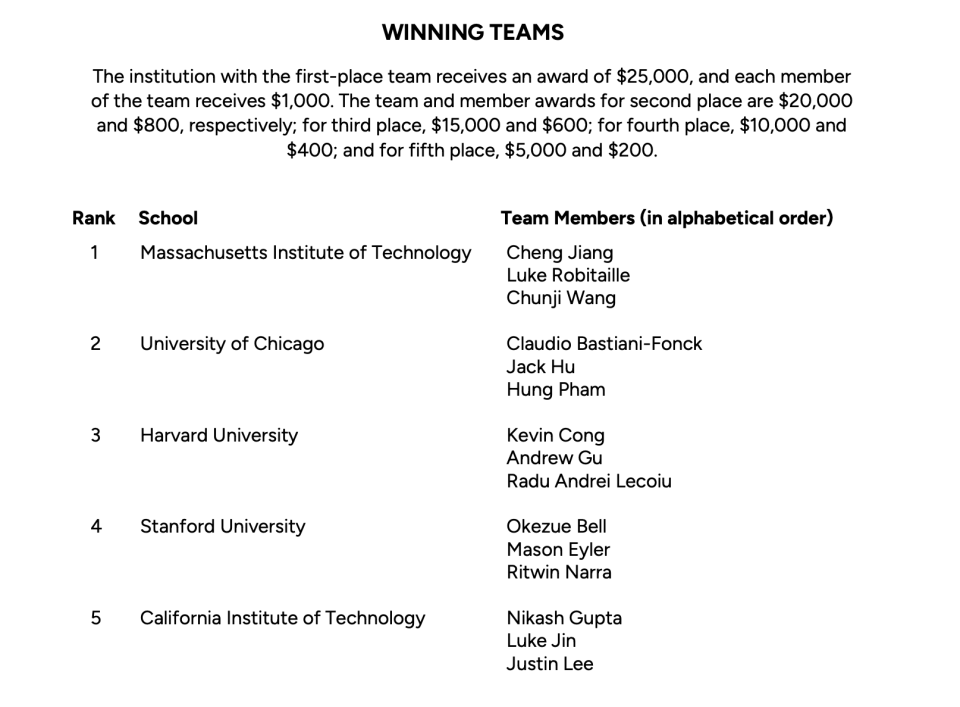 本届普特南数学竞赛前五名团队排名分辩如下: