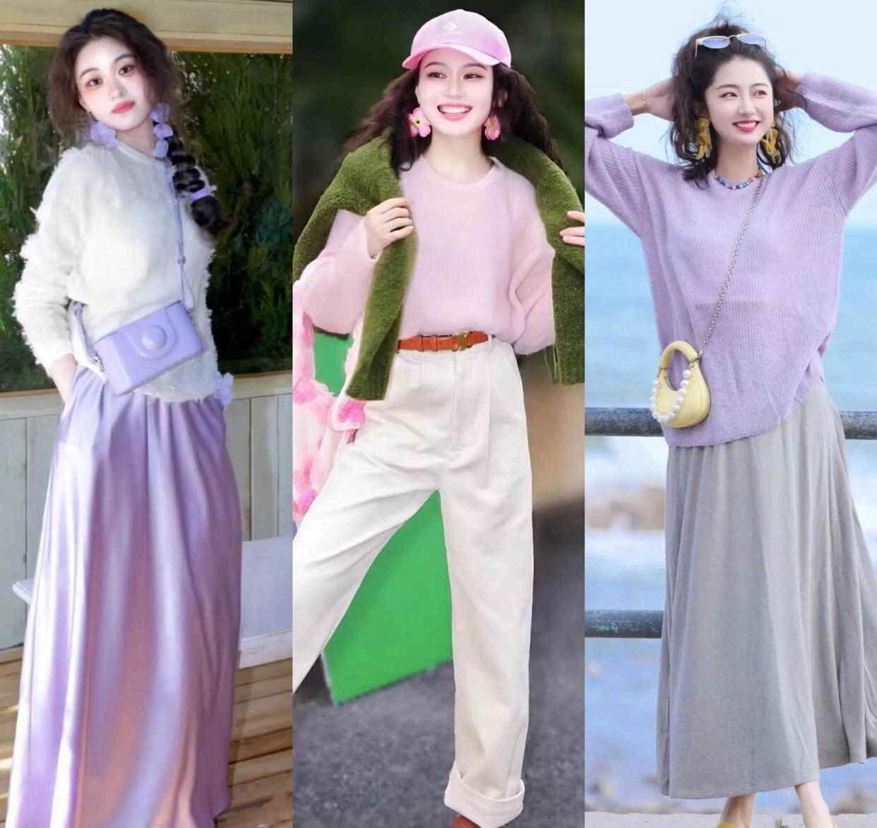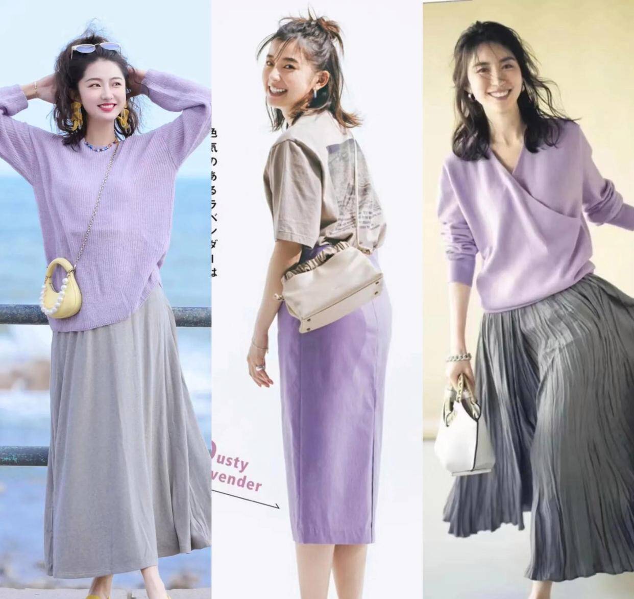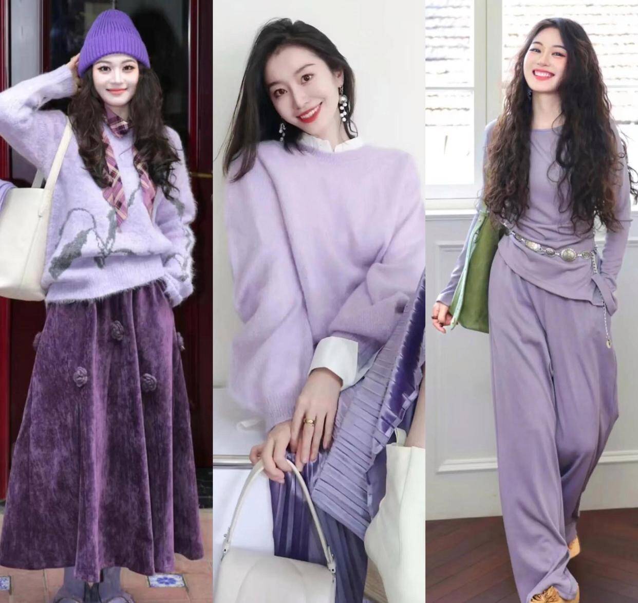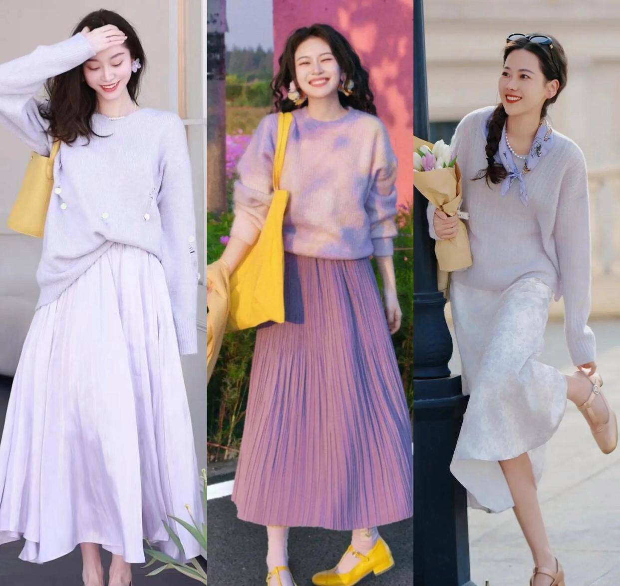 番红色的渐变毛衣,搭配了紫色的半裙,配色属于同色系,又有着浅深的变化,给一种温婉优雅的气质,又显得知性高档,很稳健熟悉一些的女生,独特有女东谈主味,减龄后果也可以。