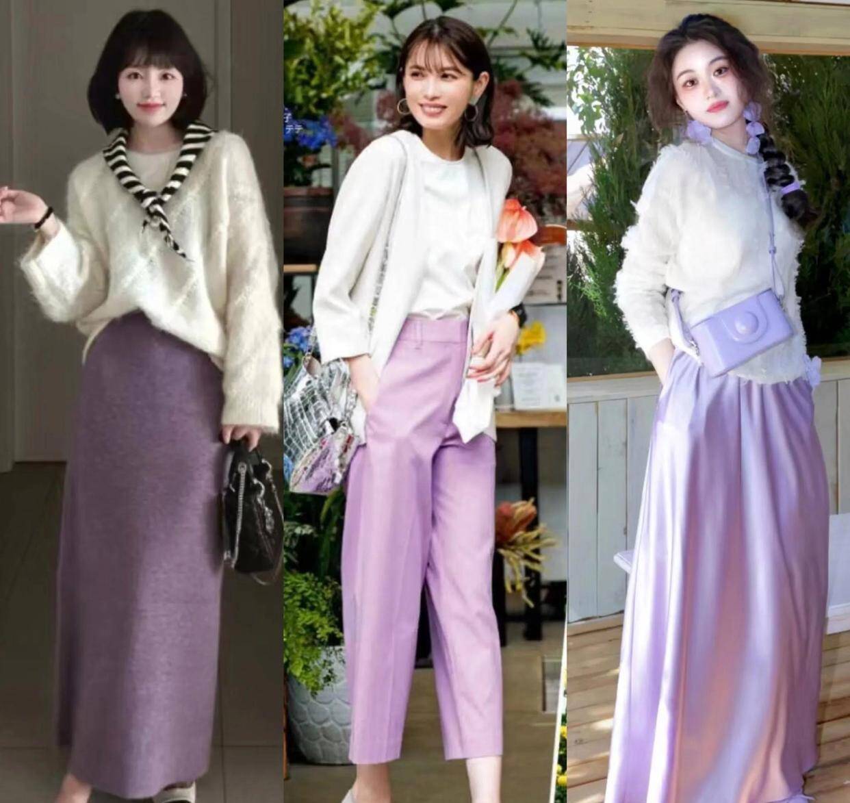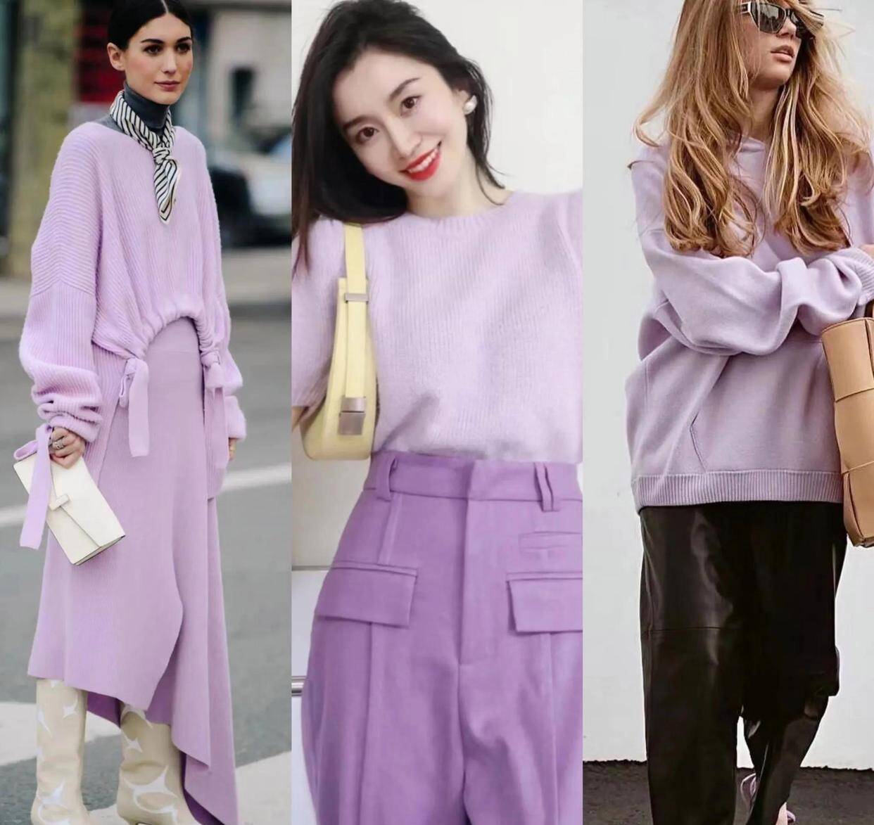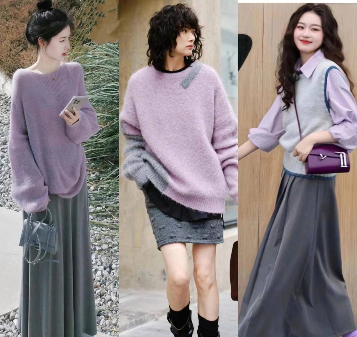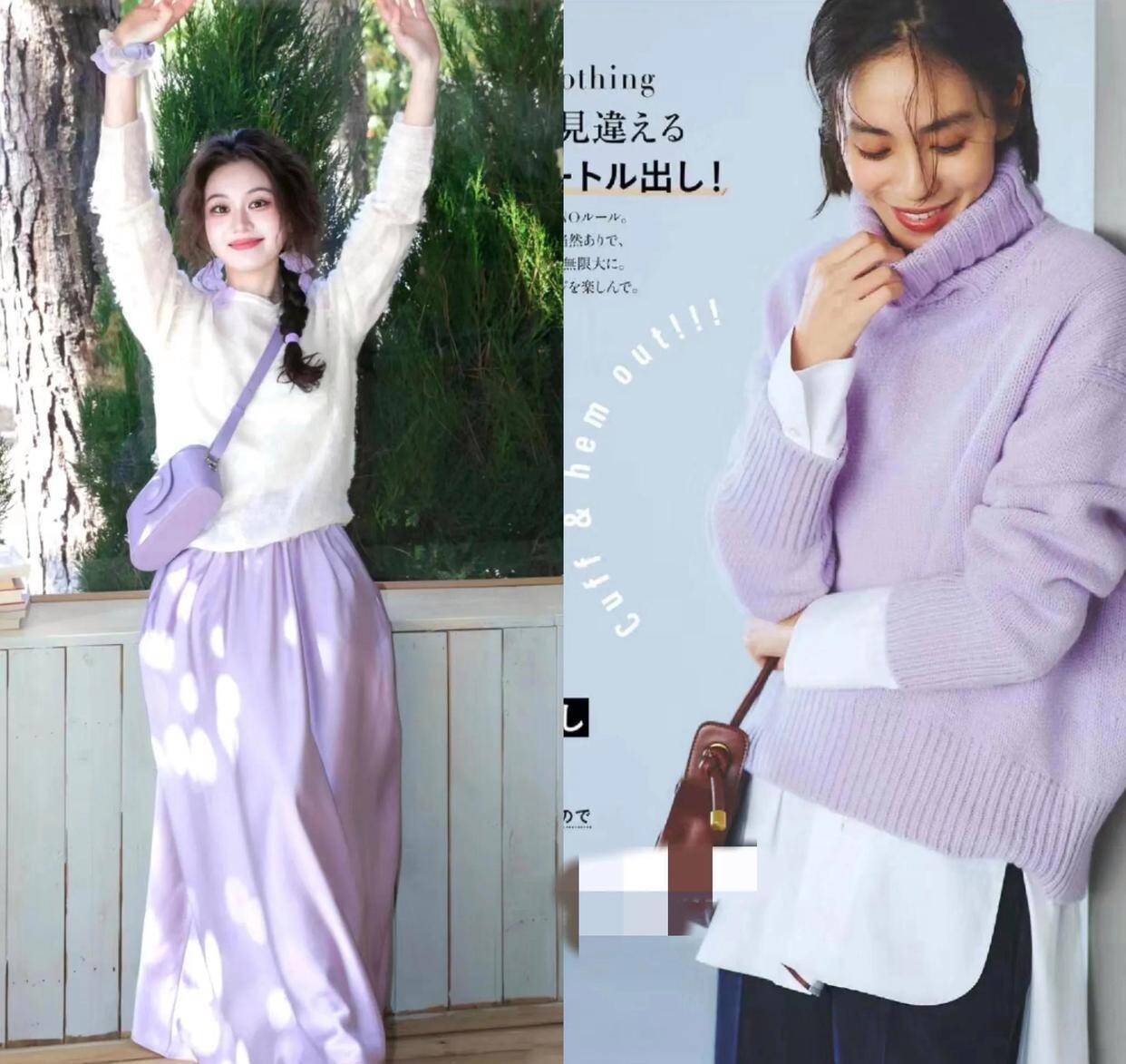 番红色的渐变毛衣,搭配了紫色的半裙,配色属于同色系,又有着浅深的变化,给一种温婉优雅的气质,又显得知性高档,很稳健熟悉一些的女生,独特有女东谈主味,减龄后果也可以。